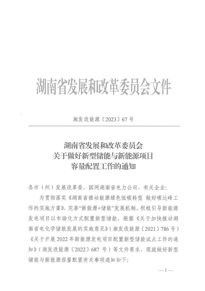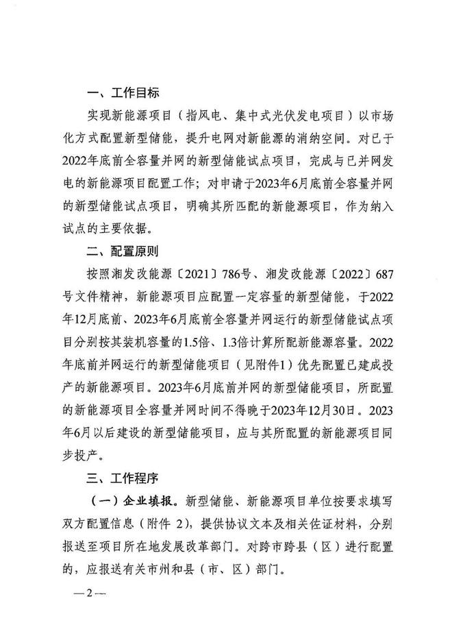 按照湖南發(fā)改委相關(guān)文件,新能源項目應(yīng)配置一定容量的新型儲能,于2022年12月底前,2023年6月底前全容量并網(wǎng)運行的新型儲能試點項目分別按其裝機(jī)容量的1.5倍、1.3倍計算所配新能源容量。