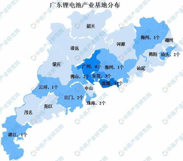 廣東是國(guó)內(nèi)重要的鋰電池基地,主要集中分布在珠三角地區(qū)。其中,深圳13個(gè),廣州4個(gè),東莞3個(gè),佛山、江門、汕頭、珠海各2個(gè),惠州、梅州、云浮、湛江各1個(gè)。