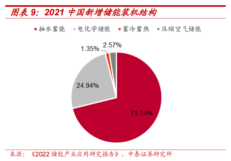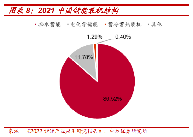 2021年中國抽水蓄能裝機功率38GW,占比全部儲能的86.52%,電化學儲能裝機功率5GW,占比11.78%,抽水蓄能是我國存量儲能的主要形式。2021年中國新增抽水蓄能裝機5GW,占比71.14%,電化學儲能新增2GW,占比24.94%,電化學儲能裝機增速超過抽水蓄能。抽水蓄能需要尋找合適地形及水域,同時可能涉及搬遷移民問題,外部限制因素較多,建設期通常長達數(shù)年。我國水電資源主要集中在南方地區(qū)尤其是西南地區(qū),西北等地區(qū)缺發(fā)建設大型抽蓄配套新能源的條件。而電化學儲能則對外界條件要求不高,建設期較短,單體投資小,因而成為新能源配儲的普遍選擇。