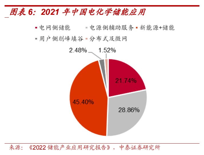 2021年起,各省密集發(fā)布新能源項目配套儲能政策,配臵比例主要在 10%-20%區(qū)間,配臵時長1-2小時,推動我國電化學儲能高速增長。根據(jù)《2022儲能產業(yè)研究報告》,2021年我國新能源配儲占電化學儲能應用的45.40%,我國電化學儲能主要應用在電源側和電網側來支持風光新能源消納和新型電力系統(tǒng)建設。