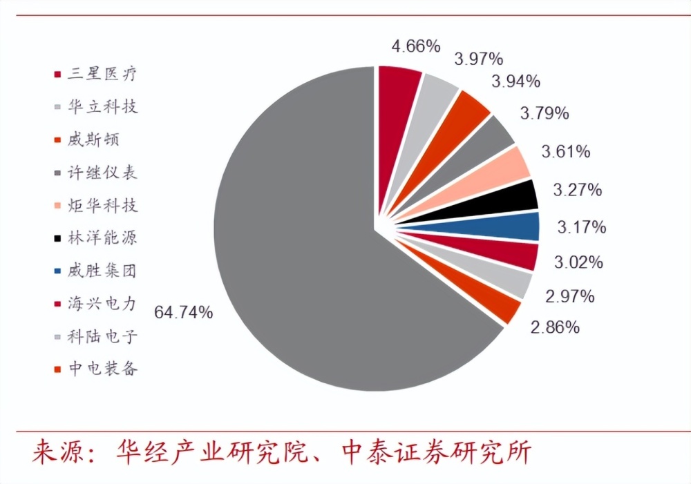 智能電表行業(yè)處于充分競爭狀態(tài),市占率穩(wěn)定。參與智能電表及用電信 息集中采集招標(biāo)的企業(yè)數(shù)量較多,國家電網(wǎng)智能電表及用電信息采集系 統(tǒng)招標(biāo)入圍公司已超過百家,集中度較低,第一梯隊三星醫(yī)療、東方威 斯頓、許繼電氣、炬華科技市占率維持在 3%-5%左右。長期來看,市場 訂單分散,我國智能電表行業(yè)競爭格局趨于穩(wěn)定。在 2022 年第一批智 能電表中標(biāo)中,三星醫(yī)療、東方威思頓、科陸電子、許繼、華立科技分 別占比 5.1%、4.8%、4.1%、4.1%、4.1%,其中,科陸電子中標(biāo)份額 較 2021 年有較大提升。