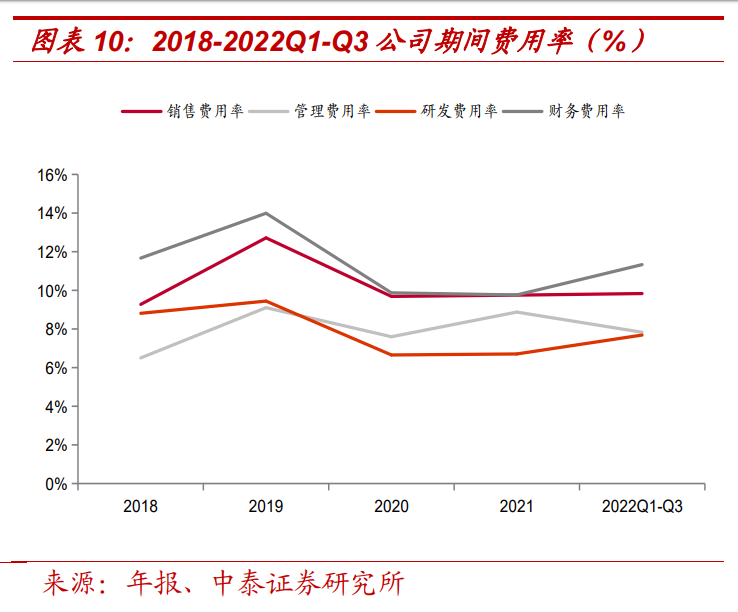 期間費(fèi)用呈下降趨勢,但仍有較大進(jìn)步空間。2019-2021 年公司期間費(fèi) 用率分別為 36.3%/45.3%/33.8%/35.1%/36.7%,雖然呈現(xiàn)總體下降趨勢, 但仍高于同行平均值,費(fèi)用管控能力有望進(jìn)一步提升。其中 2022 年前 三季度銷售/管理/研發(fā)/財務(wù)費(fèi)用率分別為 9.8%/7.8%/7.7%/11.3%,打破 前兩年的下降趨勢,主要是因?yàn)楣臼杖塍w量較低,規(guī)模效應(yīng)尚未體現(xiàn), 且公司近年來營運(yùn)資金緊缺,導(dǎo)致公司主動放棄大量周期長、墊資金額高的訂單,也限制了營收規(guī)模的增長,導(dǎo)致各方面人效降低。但隨著公 司業(yè)務(wù)擴(kuò)張的不斷推進(jìn)和資金鏈的緩解,期間費(fèi)用率有望好轉(zhuǎn)。