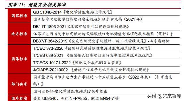 儲(chǔ)能電站裝機(jī)容量快速增長,儲(chǔ)能安全政策趨嚴(yán)。隨著大容量、高倍率的儲(chǔ)能系 統(tǒng)成為趨勢(shì),儲(chǔ)能安全問題逐漸被重視。2014 年版國標(biāo)《電化學(xué)儲(chǔ)能電站設(shè)計(jì)規(guī)范》 已很難滿足快速發(fā)展的儲(chǔ)能安全需求,國家標(biāo)準(zhǔn)之外僅有部分企標(biāo)、團(tuán)標(biāo)、地方標(biāo)準(zhǔn)、 美標(biāo) NFPA855、UL9540 等作為參考,國內(nèi)儲(chǔ)能安全標(biāo)準(zhǔn)仍需進(jìn)一步規(guī)范。