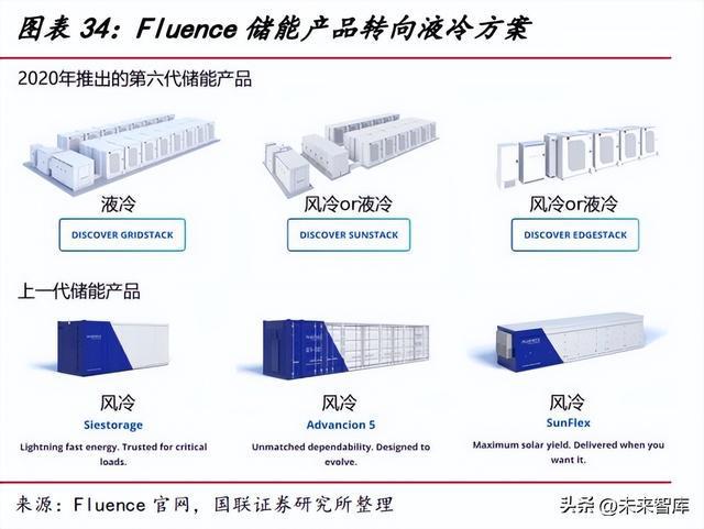 當(dāng)前國內(nèi)儲(chǔ)能液冷滲透率較低,海外市場(chǎng)對(duì)液冷接受度較高。據(jù) GGII,2021 年 國內(nèi)儲(chǔ)能領(lǐng)域液冷溫控滲透率僅為 12%,預(yù)計(jì) 2025 年有望迅速提升至 45%。海外 市場(chǎng)缺乏統(tǒng)計(jì)數(shù)據(jù),但從全球系統(tǒng)集成龍頭 Fluence 的產(chǎn)品結(jié)構(gòu)變化可以看出液冷 滲透率快速提升的趨勢(shì)。Fluence 在 2020 年以前的集成產(chǎn)品均為風(fēng)冷方案,2020 年 后推出的新一代產(chǎn)品中,光伏配儲(chǔ)和工商業(yè)儲(chǔ)能產(chǎn)品提供風(fēng)冷和液冷兩種選擇,電網(wǎng) 級(jí)儲(chǔ)能產(chǎn)品僅提供液冷配置。