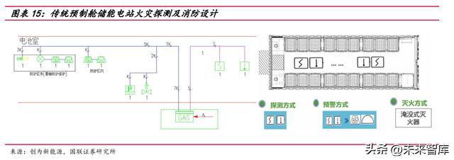當(dāng)前儲(chǔ)能系統(tǒng)火災(zāi)探測(cè)及消防設(shè)計(jì)存在不足。目前預(yù)置艙儲(chǔ)能電站火災(zāi)探測(cè)報(bào) 警系統(tǒng)參照 GB 50116《火災(zāi)自動(dòng)報(bào)警系統(tǒng)設(shè)計(jì)規(guī)范》,配置使用點(diǎn)型感溫和感煙探 測(cè)器,消防預(yù)警系統(tǒng)采用獨(dú)立的通訊方式,主要存在三點(diǎn)不足: 1)探測(cè)部分:配置的點(diǎn)型感溫和點(diǎn)型感煙探測(cè)器,只有在煙氣和溫度已經(jīng)蔓延 到艙室后才能起到報(bào)警作用,不適用于鋰離子電池?zé)崾Э卦缙陬A(yù)警,屬于電池?zé)釘U(kuò)散 事故發(fā)生后的火災(zāi)報(bào)警。 2)火災(zāi)抑制部分:在整個(gè)預(yù)制艙內(nèi)做淹沒式的滅火藥劑噴放,滅火藥劑無法作 用于發(fā)生熱失控的電池箱內(nèi)部,不能起到定向撲滅火災(zāi)的作用。 3)聯(lián)動(dòng)部分:傳統(tǒng)消防作為獨(dú)立運(yùn)行的系統(tǒng),無法與 BMS 或 EMS 系統(tǒng)通訊形 成有效聯(lián)動(dòng)。
