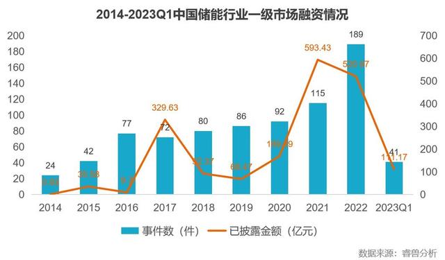 近些年國內一級市場投融資整體呈現持續(xù)下滑趨勢,但儲能行業(yè)投融資熱度持續(xù)高漲。根據睿獸分析統(tǒng)計,截至2023年3月31日,國內儲能行業(yè)有300余家企業(yè)獲得融資,涉及融資事件944件、融資金額1947億元,參與機構達1122家。中國儲能行業(yè)在2021年、2022年迎來爆發(fā),2022年中國儲能行業(yè)融資事件189件,同比增長64.3%,融資金額520.97億元,同比下降12.2%,但仍處于高位。近10年,中國儲能行業(yè)累計獲得超1900億元融資。