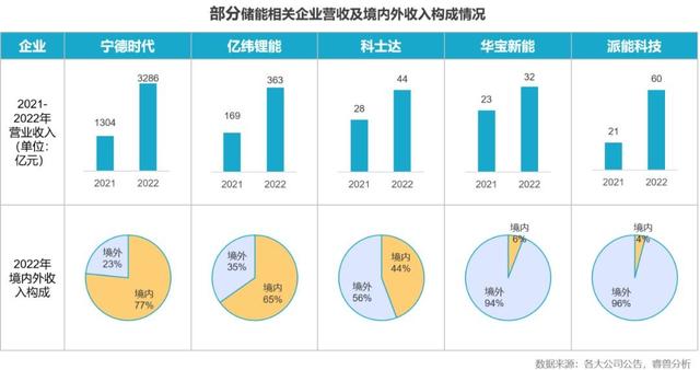2022年是儲能出海元年,之前海外儲能市場一直被日韓品牌占據,隨著海外儲能市場需求火爆,國內儲能企業(yè)紛紛出海,目前海外儲能市場已經成為國內儲能企業(yè)創(chuàng)收貢獻最大的市場。根據已發(fā)布2022年度報告的儲能上市企業(yè)數據,多數儲能相關企業(yè)營收獲得兩位數以上增長,其中寧德時代、億緯鋰能、派能科技等企業(yè)營收增長超過100%;企業(yè)海外市場營收增速較快,部分企業(yè)海外市場營收占比超過90%,華寶新能、派能科技境外營收比重分別達到94%和96%。
