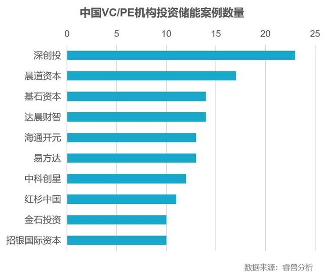 睿獸分析數據顯示,深創(chuàng)投、晨道資本、基石資本、達晨財智等VC/PE機構投資儲能產業(yè)比較活躍,投資領域涉及上游材料、動力電池、儲能系統(tǒng)、工商業(yè)儲能、電池回收利用等領域,基本涵蓋儲能全產業(yè)鏈。