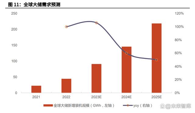 全球大儲市場高速發(fā)展,帶動儲能溫控需求大幅提升。隨著全球范圍上風電、 光伏裝機的快速提升,中國、美國、歐洲、澳洲等各大市場對于大儲的需求均呈 現(xiàn)快速增 長態(tài)勢。 我們預計 2023-2025 年 中 國 大 儲 需 求 增速分別為 100%/60%/50%;美國大儲需求增速分別為 150%/50%/40%,其他地區(qū)大儲 需求增速分別為 80%/70%/60%,測算得 2023-2025 年全球大儲需求分別為 91/145/218GWh,2022-2025 年復合增長率達 71%。