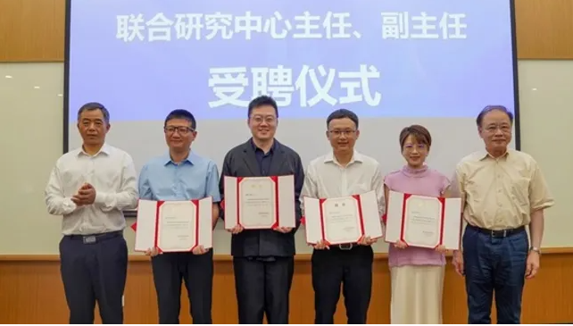 中國科學(xué)院院士馬余剛(左一)、褚君浩(右一)為聯(lián)合研究中心負(fù)責(zé)人頒發(fā)聘書