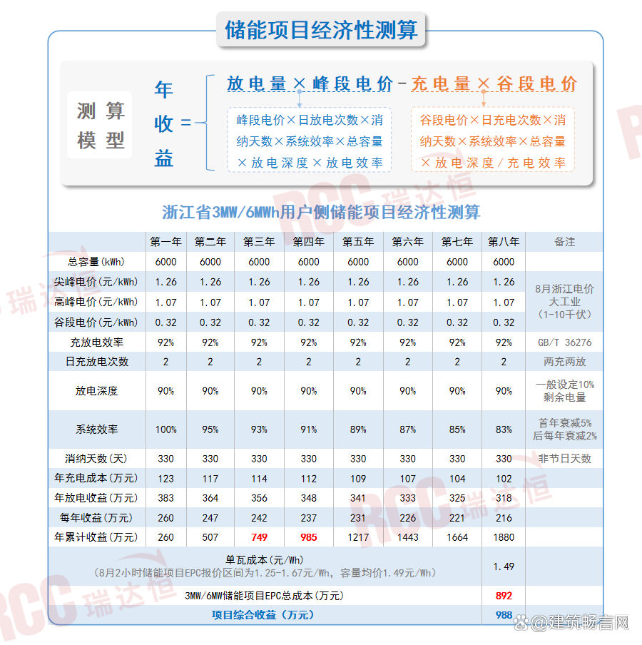 RCC瑞達恒研究院基于8月份的電價及儲能項目EPC中標均價等數(shù)據(jù),以浙江省某化纖生產公司3MW/6MW的用戶側儲能項目為例進行經濟性測算得出:該項目約3.5年便可回收項目建設成本,按項目運行周期8年測算,項目可為業(yè)主節(jié)省988萬元的電費。