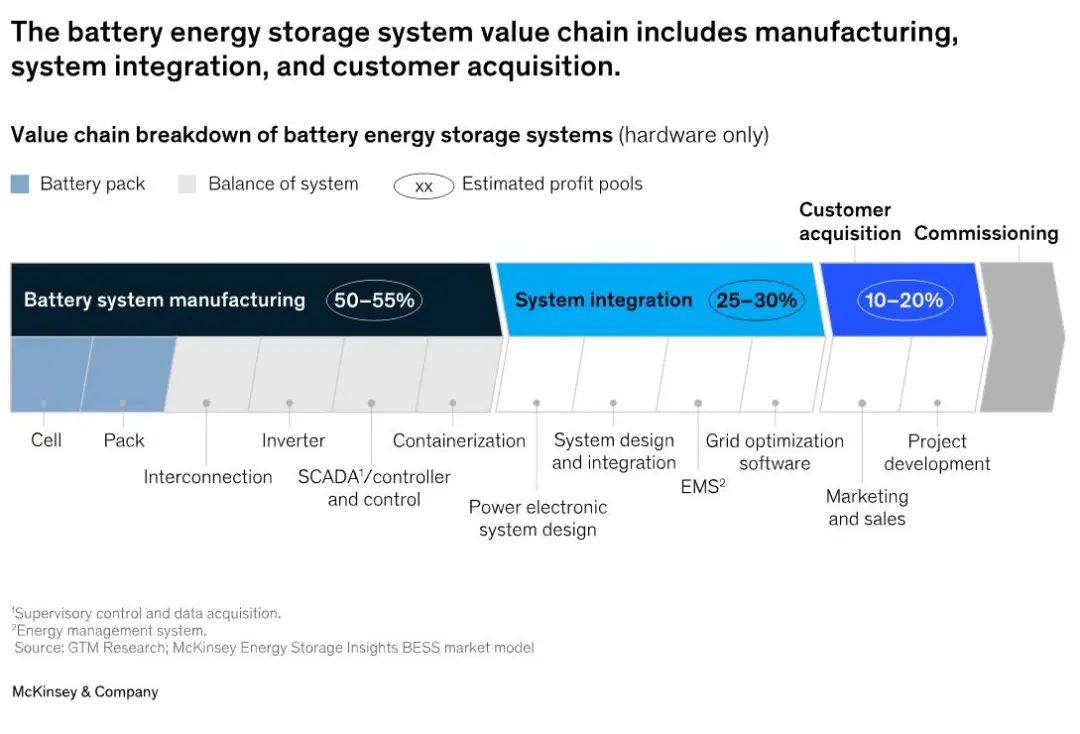 然后是系統(tǒng)集成活動,包括能源管理系統(tǒng)和其他軟件的總體設計和開發(fā),以使電化學儲能更加靈活和有用。預計這些集成商將獲得另外25%至30%的利潤。最后,10%到20%的利潤池與銷售實體、項目開發(fā)組織、其他客戶獲取活動和調(diào)試相關。
