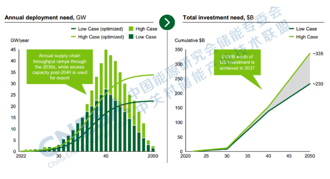 備注:圖中PUC代表公共事業(yè)委員會,RA代表資源充足。起飛點被定義為LDES行業(yè)成為一個很大程度上自我維持的市場;在鋰離子電池競爭的情況下,仍然需要多日/周的LDES技術(shù),而積極的鋰離子電池將減少供應鏈建設的需求。