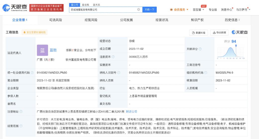 南方財經(jīng)11月7日電,天眼查App顯示,近日,防城港蓄能發(fā)電有限公司成立,法定代表人為藍勝,注冊資本3億人民幣,經(jīng)營范圍含水力發(fā)電、電氣安裝服務(wù)、通用設(shè)備修理、電氣設(shè)備修理、工程管理服務(wù)、發(fā)電技術(shù)服務(wù)、單位后勤管理服務(wù)、非居住房地產(chǎn)租賃等。股東信息顯示,該公司由南網(wǎng)儲能全資持股。