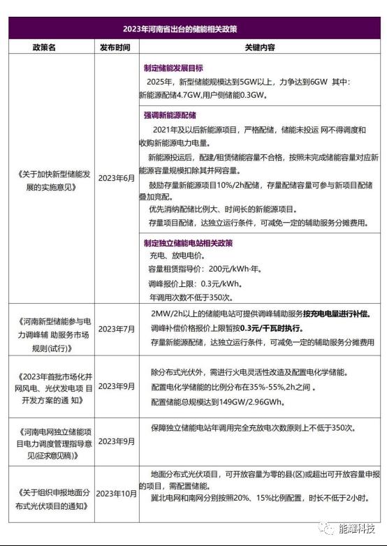 為推動河南儲能項目的開展,2023年,河南省密集出臺多項政策推動儲能發(fā)展,涉及電力調(diào)峰輔助服務(wù)、新能源配儲、獨立儲能容量租賃及調(diào)用次數(shù)等多方面。