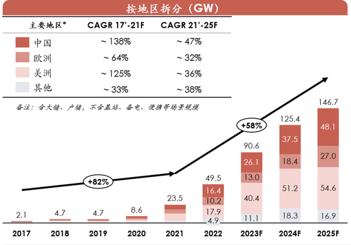 實際上,電化學儲能行業(yè)依然增長不錯。國內(nèi)的新增裝機量翻倍,美國、歐洲整體增速也在50%左右。這三個地區(qū)占全球比例達到86%,基本代表了全球行業(yè)狀況。而這個增速,已經(jīng)讓許多行業(yè)流口水了。