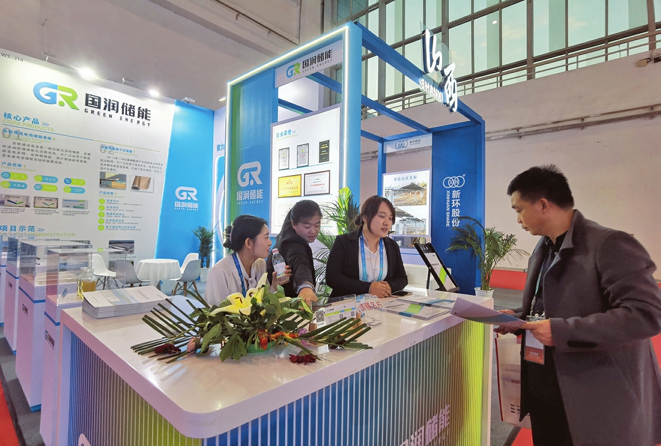 鏈博會上,工作人員向參展商介紹全釩液流電池。本報(bào)通訊員攝