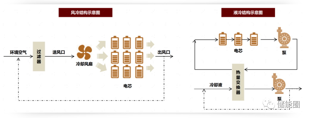 儲能溫控技術(shù)方案主要分為風(fēng)冷及液冷。風(fēng)冷是以低溫空氣為介質(zhì),利用自然風(fēng)或風(fēng)機(jī)與電芯產(chǎn)生熱對流,進(jìn)而降低電池溫度。