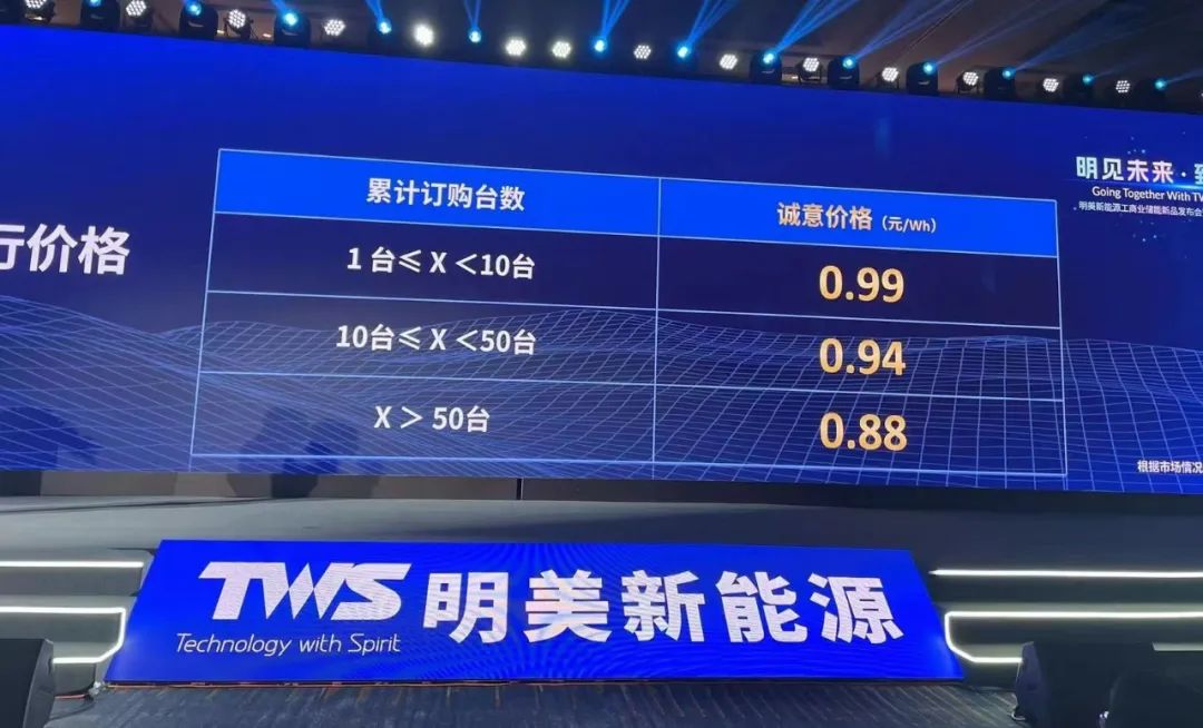 工商業(yè)領(lǐng)域的最低報(bào)價(jià)為0.88元/Wh,來自明美新能源,液冷系統(tǒng)。去年12月8日,在其舉辦的工商業(yè)儲(chǔ)能新品發(fā)布會(huì)暨戰(zhàn)略合作伙伴發(fā)展大會(huì)上,官宣了這一價(jià)格。