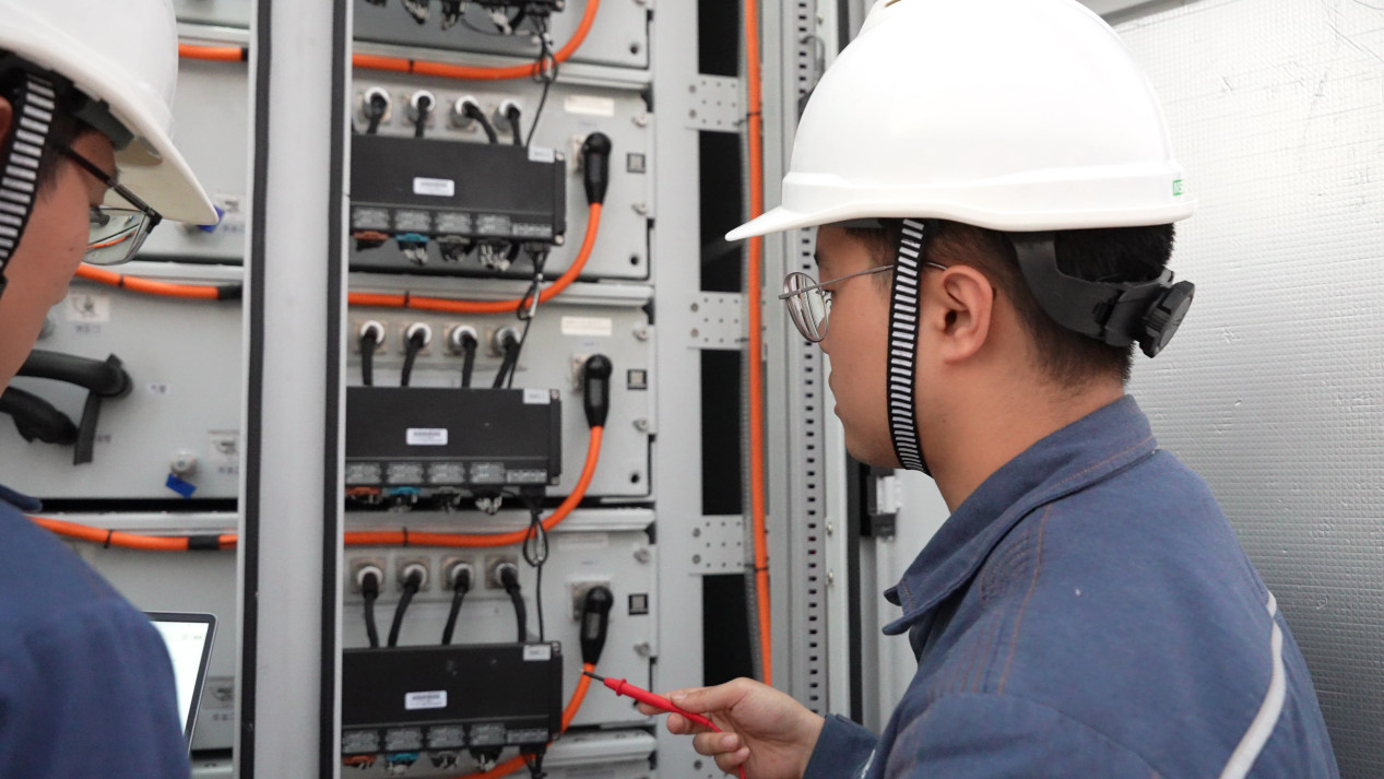 而在結(jié)構(gòu)連接方面,寶塘儲(chǔ)能站的連接方式多達(dá)5種,組串式、雙極式、單極式、低壓級(jí)聯(lián)、高壓級(jí)聯(lián)。其中,“高壓級(jí)聯(lián)”是南方電網(wǎng)首批“揭榜掛帥制”科研項(xiàng)目的攻關(guān)技術(shù),實(shí)體成果“我國(guó)首個(gè)高壓移動(dòng)式儲(chǔ)能站”于2023年初在河北保定投運(yùn)。這種新技術(shù)通過模塊級(jí)聯(lián)的方式將儲(chǔ)能系統(tǒng)電壓直接升至10千伏,在大幅減少儲(chǔ)能系統(tǒng)數(shù)量的情況下實(shí)現(xiàn)同等效率,省去變壓器的儲(chǔ)能系統(tǒng)可靈活移動(dòng),解決了傳統(tǒng)儲(chǔ)能應(yīng)用場(chǎng)景受限的問題,迅速成為行業(yè)研發(fā)應(yīng)用的“熱門”。“安裝在寶塘儲(chǔ)能站的兩套高壓級(jí)聯(lián)儲(chǔ)能系統(tǒng),相對(duì)于河北保定系統(tǒng),硬件結(jié)構(gòu)及控制保護(hù)方面均實(shí)現(xiàn)了技術(shù)優(yōu)化,綜合性能更優(yōu)。”南網(wǎng)儲(chǔ)能高壓級(jí)聯(lián)攻關(guān)團(tuán)隊(duì)成員李勇琦指著新投運(yùn)的高壓級(jí)聯(lián)電池艙說道。