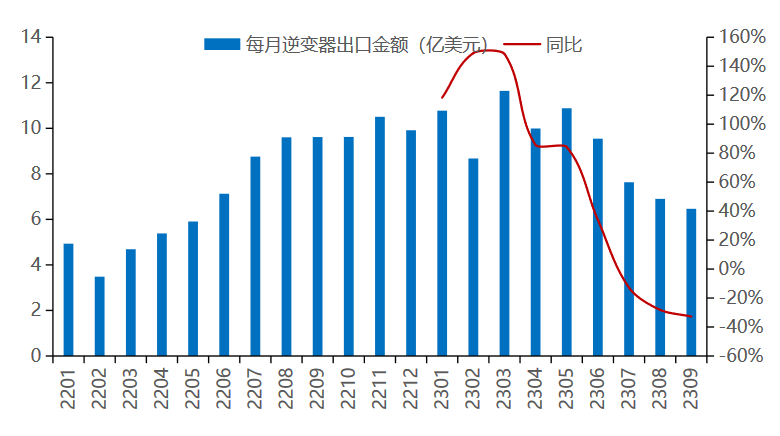 2023年9月國內(nèi)出口光儲逆變器金額6.5億美元,同比-33%,環(huán)比-6%;