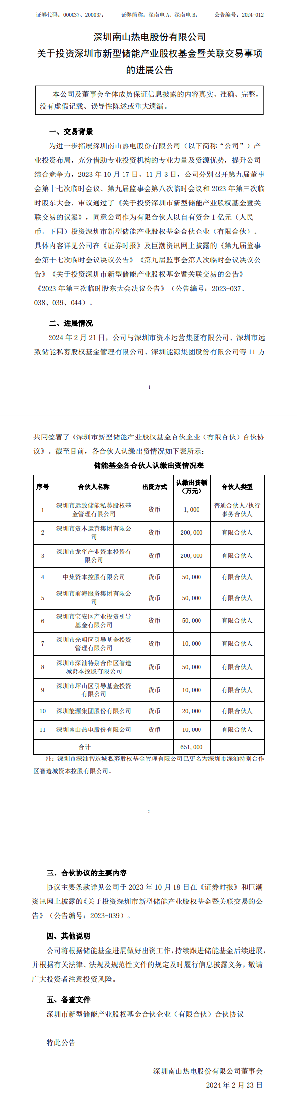 近日,深圳南山熱電股份有限公司發(fā)布《關于投資深圳市新型儲能產(chǎn)業(yè)股權基金暨關聯(lián)交易事項的進展公告》。