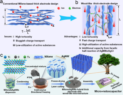 圖3.a) 具有密堆積結(jié)構(gòu)的傳統(tǒng)MXene厚電極設(shè)計與b)具有類木質(zhì)微結(jié)構(gòu)的MXene/AgNWs混合厚電極設(shè)計在結(jié)構(gòu)和功能上的優(yōu)勢比較;c) 類木MXene/AgNWs混合厚電極的制備過程和微型氧化還原電容器的組裝示意圖。