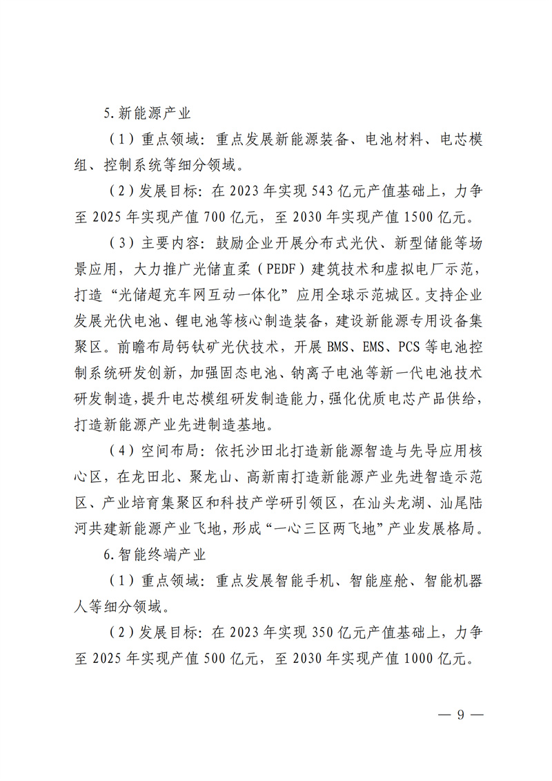 3月14日,坪山區(qū)人民政府發(fā)布關(guān)于打造具備國(guó)際競(jìng)爭(zhēng)力的產(chǎn)業(yè)集群和培育具有發(fā)展?jié)摿Φ漠a(chǎn)業(yè)集群的意見(jiàn),文件指出,在2023年實(shí)現(xiàn)543億元產(chǎn)值基礎(chǔ)上,力爭(zhēng)至2025年實(shí)現(xiàn)產(chǎn)值700億元,至2030年實(shí)現(xiàn)產(chǎn)值1500億元。主要內(nèi)容涉及鼓勵(lì)企業(yè)開(kāi)展分布式光伏、新型儲(chǔ)能等場(chǎng)景應(yīng)用,大力推廣光儲(chǔ)直柔(PEDF)建筑技術(shù)和虛擬電廠示范,打造“光儲(chǔ)超充車(chē)網(wǎng)互動(dòng)一體化”應(yīng)用全球示范城區(qū)。支持企業(yè)發(fā)展光伏電池、鋰電池等核心制造裝備,建設(shè)新能源專(zhuān)用設(shè)備集聚區(qū)。前瞻布局鈣鈦礦光伏技術(shù),開(kāi)展BMS、EMS、PCS等電池控制系統(tǒng)研發(fā)創(chuàng)新,加強(qiáng)固態(tài)電池、鈉離子電池等新一代電池技術(shù)研發(fā)制造,提升電芯模組研發(fā)制造能力,強(qiáng)化優(yōu)質(zhì)電芯產(chǎn)品供給,打造新能源產(chǎn)業(yè)先進(jìn)制造基地。