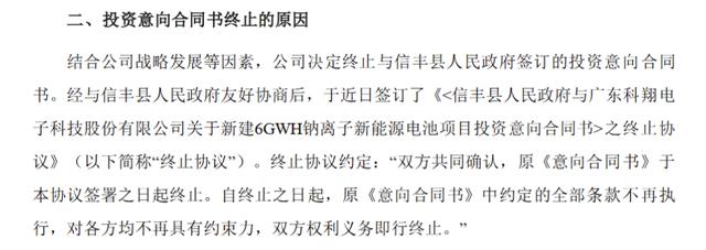 據(jù)科翔股份董秘辦的工作人員回應(yīng)稱,這是公司根據(jù)發(fā)展情況做出的決定,也表示公司還在繼續(xù)做鈉離子電池,后續(xù)應(yīng)該會披露進展。信豐縣的終止項目是意向協(xié)議,而與大亞灣簽訂的是正式協(xié)議。