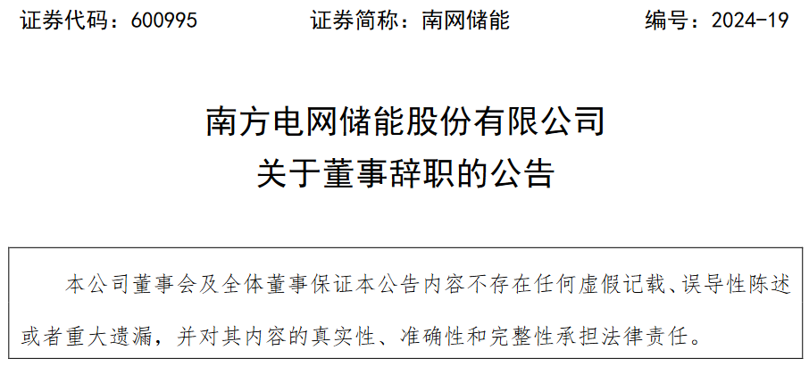 南網(wǎng)儲(chǔ)能于4月16日發(fā)布晚間公告稱,2024年4月16日,南方電網(wǎng)儲(chǔ)能股份有限公司(以下簡(jiǎn)稱“公司”)董事會(huì)收到非獨(dú)立董事江裕熬先生遞交的書面辭職報(bào)告,江裕熬先生由于達(dá)到法定退休年齡,申請(qǐng)辭去公司董事及董事會(huì)科技創(chuàng)新委員會(huì)委員職務(wù)。