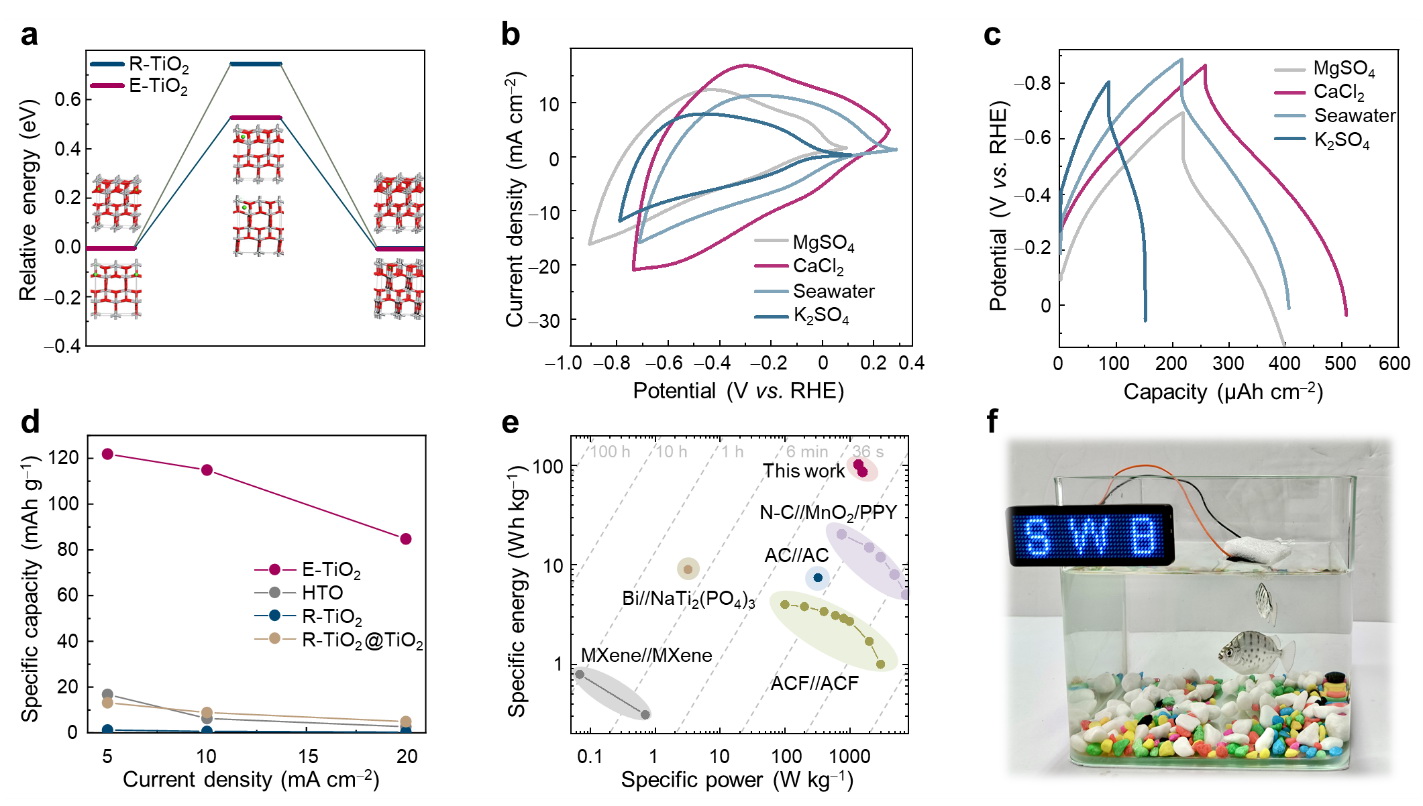 要點(diǎn)5:圖5a的DFT計(jì)算表明,E-TiO2同樣可以降低其他陽離子的擴(kuò)散勢壘(例如Ca2+)。通過CV和GCD(圖5b,c)可知,E-TiO2在其他電解液中也具有類似于儲(chǔ)鈉時(shí)的贗電容主導(dǎo)特性。當(dāng)電流密度為10mA/cm2時(shí),E-TiO2儲(chǔ)存Ca2+和Mg2+的面容量分別為247和182 μAh/cm2,接近Na+的容量(259 μAh/cm2)。直接使用天然海水作為電解液,構(gòu)建了以E-TiO2為負(fù)極材料,電催化劑為正極的海水二次電池。在5 mA/cm2的電流密度下,E-TiO2的比容量為152 mAh/g(圖5d)?;谡?fù)極活性物質(zhì)的質(zhì)量,新型海水電池的比能量/功率密度優(yōu)于當(dāng)前報(bào)道的可充放海水儲(chǔ)能器件、水系鈉鉀及鎂鈣離子電池(圖5e)。團(tuán)隊(duì)對二次海水電池的原型也進(jìn)行了展示(圖5f)。