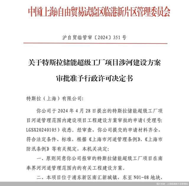 5月8日,上海臨港新片區(qū)管委會官網(wǎng)顯示,已公布關(guān)于與特斯拉儲能超級工廠項目涉河建設(shè)方案審批準予行政許可決定書,同意特斯拉(上海)報審的特斯拉儲能超級工廠項目在南奉界河河道管理范圍內(nèi)的有關(guān)工程建設(shè)方案。