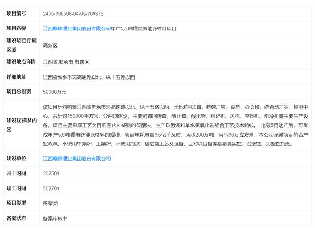 該項目編號為2405-360598-04-05-769372,項目名稱為“江西贛鋒鋰業(yè)集團股份有限公司年產(chǎn)5萬噸鋰電新能源材料項目”。贛鋒鋰業(yè)作為建設(shè)單位,此次項目的開工時間定于2025年1月,預(yù)計竣工時間為2027年1月,項目類型為備案類,目前備案狀態(tài)為備案審核中。