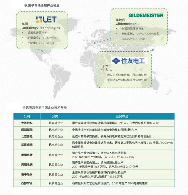 2022 年全釩液流電池整個行業(yè)還處于商業(yè)化進程緩慢階段,全球范圍內(nèi)只有日本住友電工、美國 UniEnergyTechnologies、奧地利 Gildemeister 和中國大連融科能提供成熟的商業(yè)化產(chǎn)品。2023年,隨著我國在長時儲能、價格補償、鼓勵釩資源開發(fā)等支持政策的落地生效以及資本市場的追捧,全釩液流電池賽道創(chuàng)新企業(yè)涌現(xiàn),推動我國全釩液流儲能技術(shù)和產(chǎn)業(yè)發(fā)展向世界領(lǐng)先水平邁進。