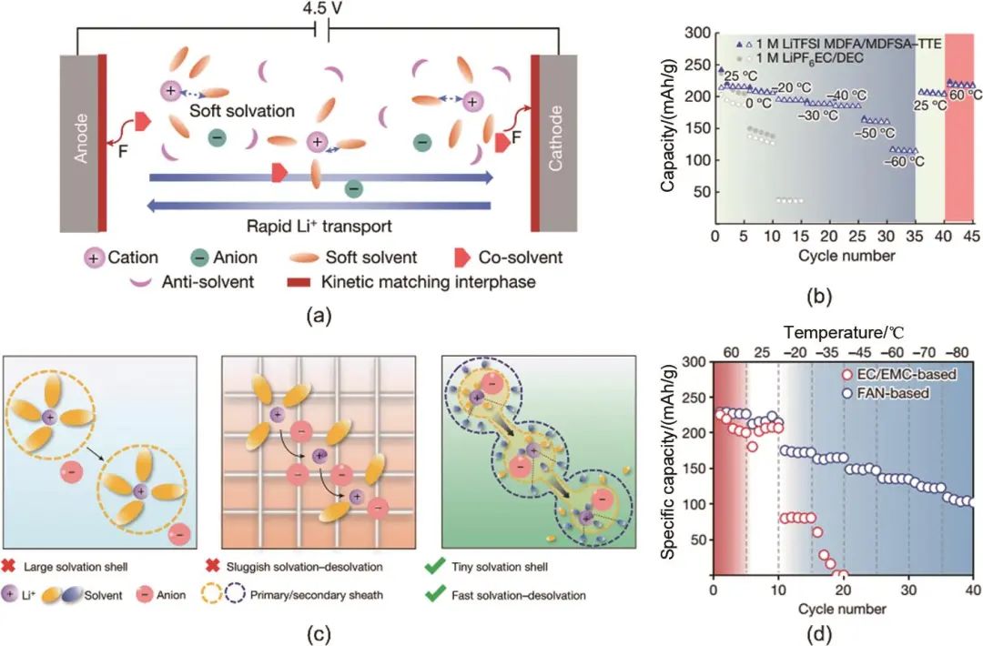 圖10 (a) “軟”溶劑化結(jié)構(gòu)的機(jī)理示意圖;(b) 不同溫度下使用“軟”溶劑電解液的石墨/NMC電池的循環(huán)性能;