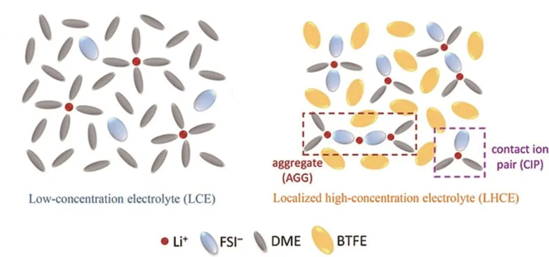 近些年來,高濃度電解液(HCEs)受到了廣泛的關(guān)注,通過提高電解液中的鋰鹽濃度,使得大量的鋰離子將全部溶劑完全配位,顯著提高溶劑的HOMO能級(jí),提高電解液的電化學(xué)穩(wěn)定性。更重要的是當(dāng)溶劑分子和鋰離子的摩爾比大于4時(shí),溶劑分子不足以和大量的鋰離子完全配位,因此陰離子會(huì)“擠”進(jìn)溶劑化鞘中,形成接觸離子對(duì)的CIP結(jié)構(gòu)和聚集離子對(duì)的AGG結(jié)構(gòu),這一存在陰離子的溶劑化結(jié)構(gòu)相較于原有的SSIP結(jié)構(gòu)擁有更低的去溶劑化能壘,并且參與溶劑化的陰離子表現(xiàn)出更低的LUMO能級(jí),在形成SEI/CEI過程中,溶劑化結(jié)構(gòu)中的陰離子會(huì)優(yōu)先還原分解,形成含有更多陰離子衍生的無機(jī)組分的SEI,其擁有更好的電化學(xué)性能和機(jī)械穩(wěn)定性、更有利的鋰金屬兼容性,顯著提高鋰金屬負(fù)極的循環(huán)穩(wěn)定性。但是HCEs的黏度高、潤濕性差、電導(dǎo)率低等問題使得其在低溫下幾乎不能使用,并且由于超高的鋰鹽黏度,電池的能量密度顯著下降,成本也不可接受,這些都限制了HCEs的實(shí)際運(yùn)用。為了解決HCEs的種種問題,研究人員提出使用非極性的低黏度稀釋劑來稀釋HCEs,非極性稀釋劑與鋰離子沒有相互作用,有效保留HCEs中特殊的CIP和AGG溶劑化結(jié)構(gòu)的同時(shí),可降低鋰鹽濃度和電解質(zhì)的黏度,提高了整體電解液的電導(dǎo)率。如圖8所示,這種采用稀釋高濃電解液的方式得到的電解液被稱為局部高濃電解液(LHCEs),其保留了HCEs優(yōu)點(diǎn)的同時(shí),極大地改進(jìn)了HCEs的缺點(diǎn),并且降低了成本,提高了整體的能量密度。