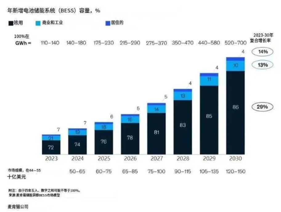 跨國知名咨詢公司麥肯錫預計:公用事業(yè)規(guī)模的電化學儲能(已占新增年產能的大部分)將在未來六年中每年都保持增長29% 左右,是三個細分市場中增長最快的。2030年,電池儲能系統(tǒng)的市場容量可能會增加5倍。到2030 年,公用事業(yè)規(guī)模的年度裝機容量將達到 450 至 620 吉瓦時(gwh),公用事業(yè)規(guī)模的電化學儲能將占據當年總市場的90%,全球電化學儲能全部市場需求將達到700gwh,1200億至1500 億美元,或1萬億人民幣左右。