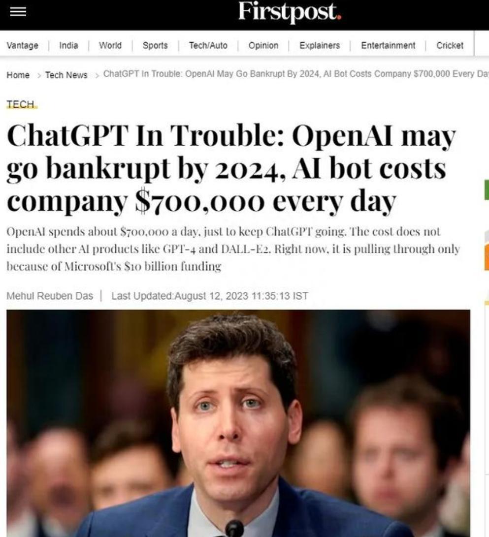 2023 年 1 月,投資銀行摩根士丹利的一份分析報告稱,在 ChatGPT 上回復的成本約為谷歌搜索查詢平均成本的 6 倍至 28 倍。根據(jù)摩根士丹利最近的分析,谷歌去年 3.3 萬億次搜索的平均成本約為每次 0.2 美分。因此可以看出,ChatGPT 聊天回復成本為 1.2 美分至 5.6 美分之間。根據(jù)公開的信息顯示,GPT4 一次完整的訓練大約需要 6000 多萬美元,報道所說的 ChatGPT 每天耗費 70 萬美元,應該主要是數(shù)據(jù)中心的日常算力消耗。僅在 2022 年 OpenAI 的財務(wù)凈虧損就高達 5.45 億美元。甚至有印度媒體聲稱 OpenAI 有在 2024 年倒閉的可能。