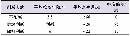 由于規(guī)劃周期較長,考慮了未來峰荷發(fā)展和DG接入容量的變電站規(guī)劃面臨很大的不確定性和投資風(fēng)險(xiǎn),所以必須進(jìn)行風(fēng)險(xiǎn)評估。文獻(xiàn)[7]在相同功率約束條件下,對投資變電站和削減配電側(cè)DG發(fā)電出力兩種技術(shù)方案進(jìn)行了比較,給出了優(yōu)化的折中方法。該文獻(xiàn)以30MW變電站接入不同光伏容量(0、1、9.5MW)的情形為例,對各種削減模式下延緩?fù)顿Y的效果進(jìn)行了比較,結(jié)果如表2所示,與不削減DG容量相比,采用確定(定時)削減方式,投資年限可延緩3.4年,投資費(fèi)用可減少9.6萬歐元;采用隨機(jī)削減方式,投資年限則可延緩2.5年、投資費(fèi)用可減少1.6萬歐元。因?yàn)閷?shí)際參數(shù)的隨機(jī)特性會影響計(jì)算結(jié)果,所以真正的延緩?fù)顿Y效果主要取決于預(yù)測模型的精度。