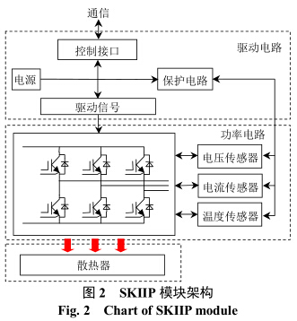 賽米控智能集成功率(Semikron integrated intel-ligent power,SKIIP)模塊[6]集成了功率半導體器件、散熱器以及具有保護和監(jiān)測電路的門極驅(qū)動電路,并具有用于短路和過電流保護的閉環(huán)電流傳感器,同時還集成了溫度傳感器。采用SKIIP模塊[6]可以大大簡化逆變器主電路,提高系統(tǒng)的抗干擾能力,該模塊具有標準接口,其架構(gòu)如圖2所示。