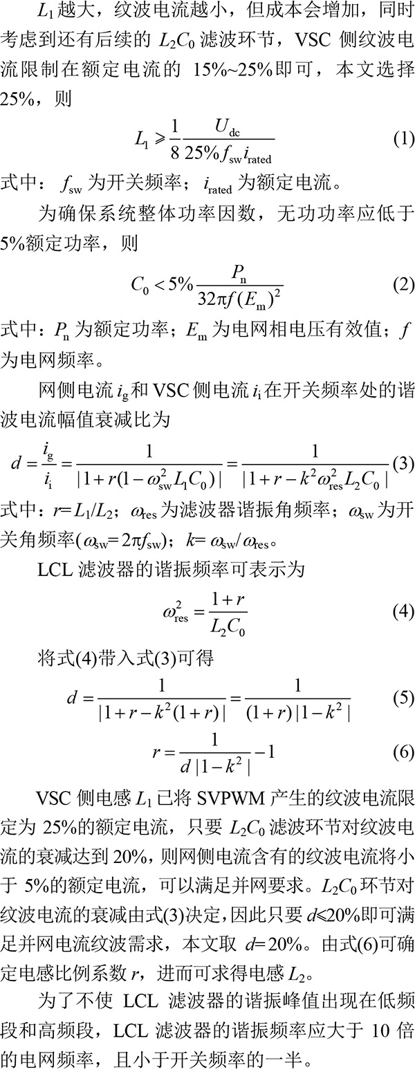 相對于傳統(tǒng)的單電感濾波器,3階LCL濾波器能更好地抑制并網(wǎng)變換器引起的電流諧波。LCL濾波器的參數(shù)對系統(tǒng)的動態(tài)及穩(wěn)態(tài)性能影響很大,文獻[7]對LCL濾波器參數(shù)的限制條件以及設計步驟做了詳細介紹,本文在此基礎上確定LCL濾波器的參數(shù)。根據(jù)VSC側(cè)電流最大允許紋波得到VSC側(cè)電感L1的最小值,根據(jù)系統(tǒng)的無功功率限定值求得濾波電容C0,最后根據(jù)并網(wǎng)電流總諧波得到網(wǎng)側(cè)電感L2。