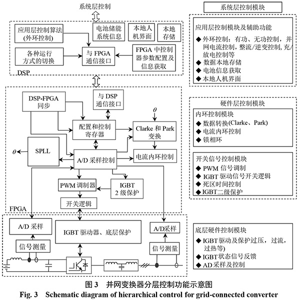 參照通信系統(tǒng)的開放系統(tǒng)互連(open system in-terconnection,OSI)模型,并網(wǎng)變換器分層控制功能示意圖如圖3所示。圖3中:θ為電網(wǎng)電壓相位;SPLL(software phase loop)為軟鎖相環(huán)[11];IGBT(insulated gate bipolar transistor)為絕緣柵雙極型晶體管。硬件層控制模塊由FPGA完成;應用層控制模塊由DSP完成算法運算,提高了系統(tǒng)靈活性;系統(tǒng)層控制由上位機完成,可以實現(xiàn)多個儲能系統(tǒng)的大規(guī)模調(diào)度。層次化的并網(wǎng)變換器接口如圖4所示。