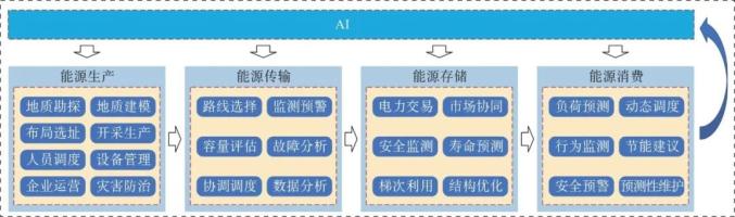 能源全產(chǎn)業(yè)鏈與AI的互相影響逐漸加深,如圖1所示。在能源生產(chǎn)環(huán)節(jié),AI技術(shù)應(yīng)用于不可再生能源(煤、石油、天然氣等)地質(zhì)勘探、地質(zhì)建模過(guò)程,極大提高勘探的效率與準(zhǔn)確性。在開(kāi)采過(guò)程中,AI驅(qū)動(dòng)的智能作業(yè)系統(tǒng)(設(shè)備)能夠根據(jù)實(shí)時(shí)地質(zhì)條件自動(dòng)調(diào)整作業(yè)參數(shù),提高作業(yè)效率和安全性。從礦床開(kāi)采全生產(chǎn)周期來(lái)看,基于AI分析的生產(chǎn)優(yōu)化模型可以通過(guò)協(xié)調(diào)調(diào)度和運(yùn)營(yíng)優(yōu)化,合理調(diào)配開(kāi)采作業(yè)強(qiáng)度,優(yōu)化生產(chǎn)周期。在可再生能源生產(chǎn)方面,利用AI技術(shù)優(yōu)化選址、設(shè)備運(yùn)行參數(shù)以及與其他能源形式的協(xié)同調(diào)度,在一定程度上可克服太陽(yáng)能、風(fēng)能等間歇性能源的不確定性,提升可再生能源在電網(wǎng)中的接入比例和穩(wěn)定性,促進(jìn)能源結(jié)構(gòu)的優(yōu)化。