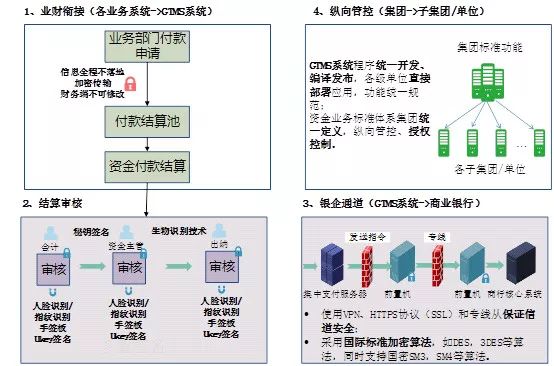 建立從業(yè)務(wù)申請、財(cái)務(wù)審核到支付通道、縱向管控全面覆蓋,符合國家信息安全等三級要求的多重資金安全保障體系,如圖1所示。