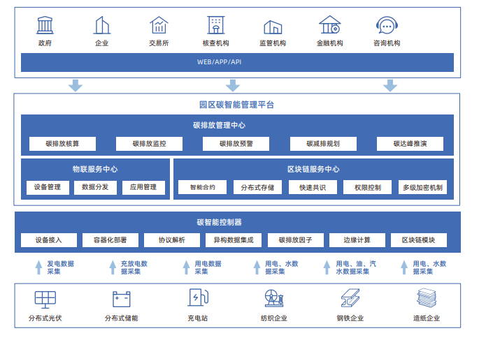 江行智能工業(yè)園區(qū)“雙碳”管理方案以雙碳目標(biāo)為引領(lǐng),以園區(qū)能源流和碳流監(jiān)控管理為基礎(chǔ),以綠色節(jié)能降碳和產(chǎn)業(yè)經(jīng)濟(jì)服務(wù)為核心,以數(shù)據(jù)為驅(qū)動(dòng),構(gòu)建工業(yè)園區(qū)碳智能管理平臺(tái),部署具備區(qū)塊鏈分布式賬本的碳智能控制器,在數(shù)據(jù)采集源頭保證碳排放數(shù)據(jù)的安全、可信和不可篡改,精準(zhǔn)有效開展園區(qū)碳排放監(jiān)管。