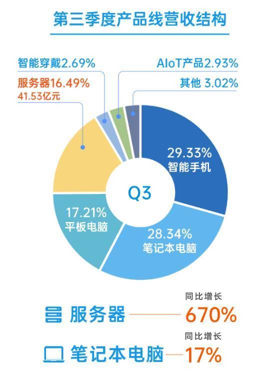其中,公司筆電業(yè)務、服務器市場持續(xù)突破,均實現(xiàn)了顯著增長。2023年第三季度公司服務器市場實現(xiàn)營業(yè)收入41.53億元,同比增長670%;筆電業(yè)務同比增長17%。