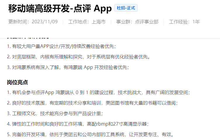 美團(tuán)發(fā)布了鴻蒙高級工程師、鴻蒙基建工程師等多個鴻蒙開發(fā)相關(guān)崗位。主要開發(fā)美團(tuán)鴻蒙App、大眾點(diǎn)評鴻蒙App。網(wǎng)易更新了高級/資深A(yù)ndroid 開發(fā)工程師崗位,職位要求參與云音樂多端多OS的產(chǎn)品(Android、鴻蒙等)研發(fā)迭代。