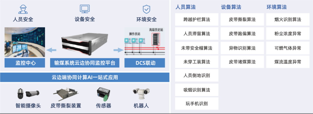 方案通過云邊端協(xié)同架構(gòu)把智能采集裝置、皮帶撕裂識(shí)別裝置、環(huán)境傳感器等進(jìn)行數(shù)據(jù)的統(tǒng)一匯聚分析,對(duì)異常情況進(jìn)行識(shí)別和報(bào)警,并通過DCS系統(tǒng)控制聯(lián)動(dòng),提高人員、設(shè)備、環(huán)境的安全管理水平。 在設(shè)備故障監(jiān)測方面,可對(duì)皮帶異物、落煤口堵煤、皮帶跑偏、運(yùn)行環(huán)境火花等情況進(jìn)行識(shí)別,避免異物運(yùn)輸對(duì)皮帶造成意外損傷或引發(fā)事故;在人員安全管控方面,設(shè)置吸煙、安全帽佩戴、翻越護(hù)欄、人員倒地等相關(guān)算法,對(duì)巡檢人員的不安全行為進(jìn)行識(shí)別管控;在環(huán)境監(jiān)控方面,通過安裝布設(shè)有毒有害氣體監(jiān)測傳感器、溫度傳感器、粉塵監(jiān)測傳感器等對(duì)輸煤環(huán)境進(jìn)行在線實(shí)時(shí)監(jiān)測,及時(shí)發(fā)現(xiàn)高溫、有毒有害氣體超標(biāo)、粉塵濃度超標(biāo)并預(yù)警,最大程度保障人員操作環(huán)境安全。