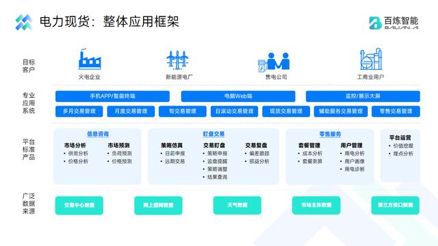 為了幫助發(fā)售電企業(yè)加速電力交易轉型,百煉智能基于先進的AI及數(shù)據分析技術、系統(tǒng)開發(fā)能力,自主研發(fā)“百煉智電”產品,為發(fā)售電企業(yè)建設一站式電力現(xiàn)貨市場交易及決策平臺,強化企業(yè)管控水平、決策能力以及用戶服務能力,實現(xiàn)電力交易收益最大化。