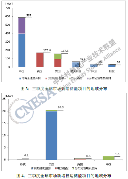 新增投運項目中,美國的裝機(jī)規(guī)模最大,為20.5MW,占三季度新增投運項目裝機(jī)總規(guī)模的90%,項目幾乎全部應(yīng)用于調(diào)頻輔助服務(wù)領(lǐng)域。